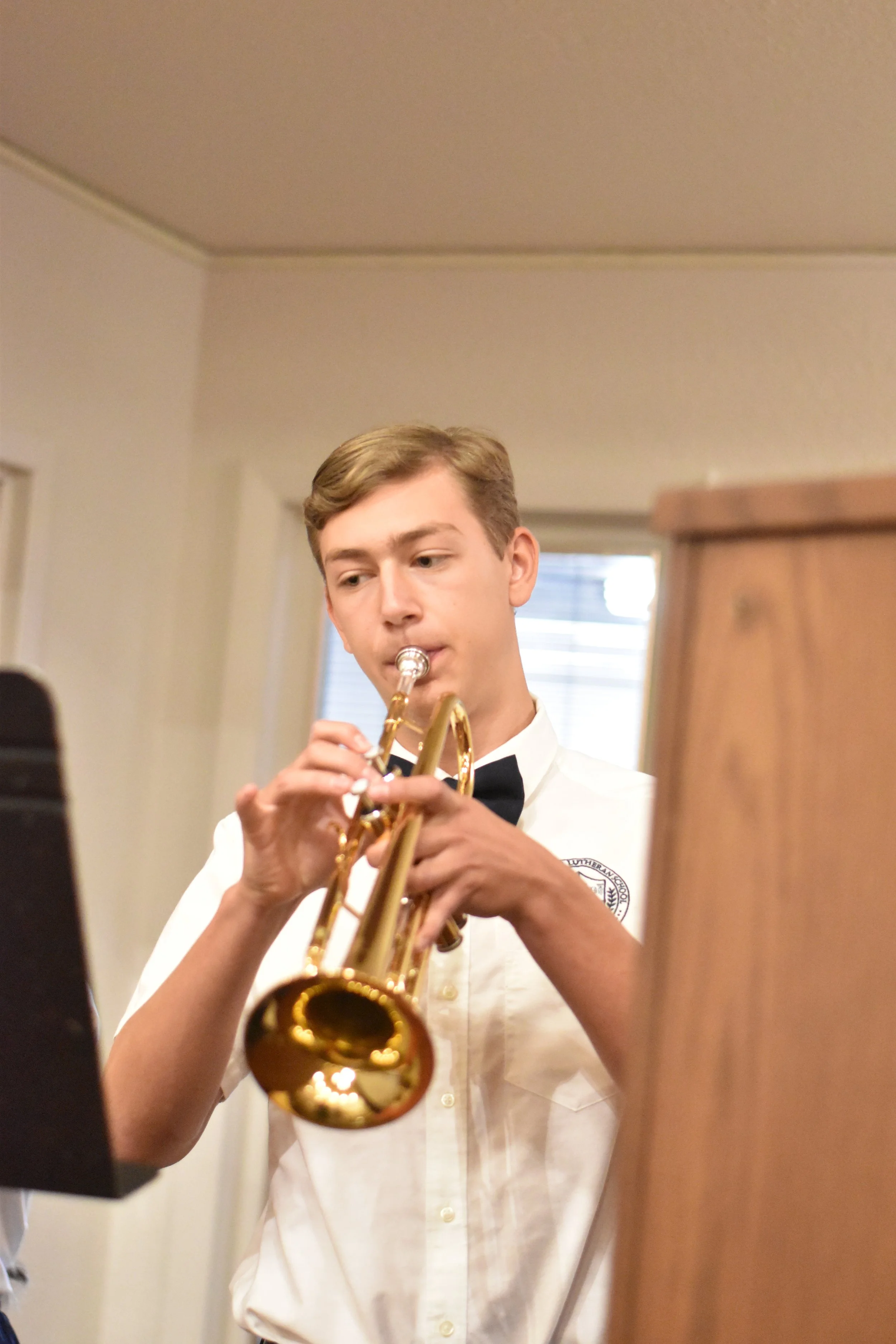 Luke Ristau practicing his trumpet before the service