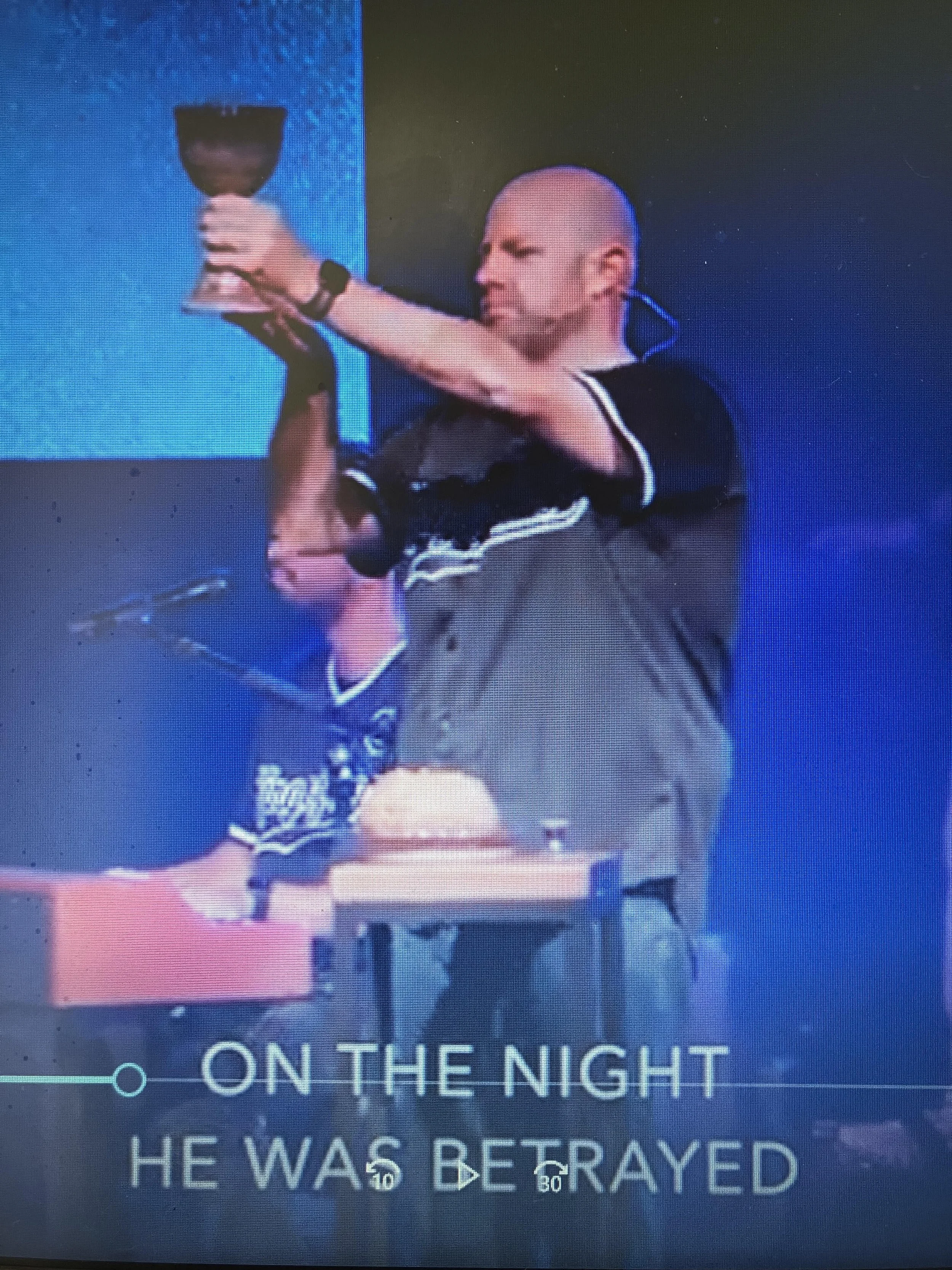 Above is a screenshot at the beginning of the “consecration” sung by the praise band girl, while the pastor, who says nothing, holds up a fake, empty chalice. His pop-top individual wine thingy is on the table next to the prop loaf of bread.